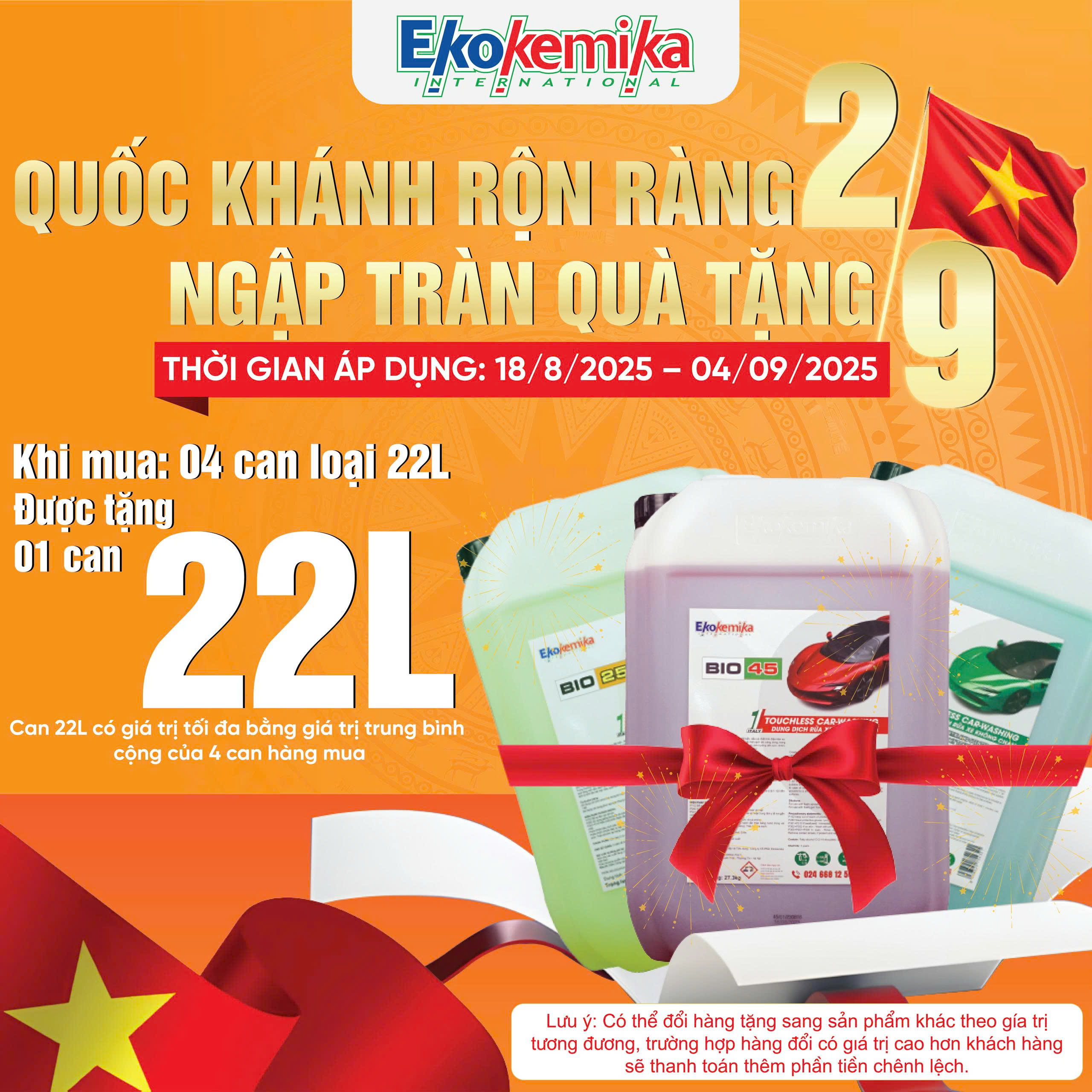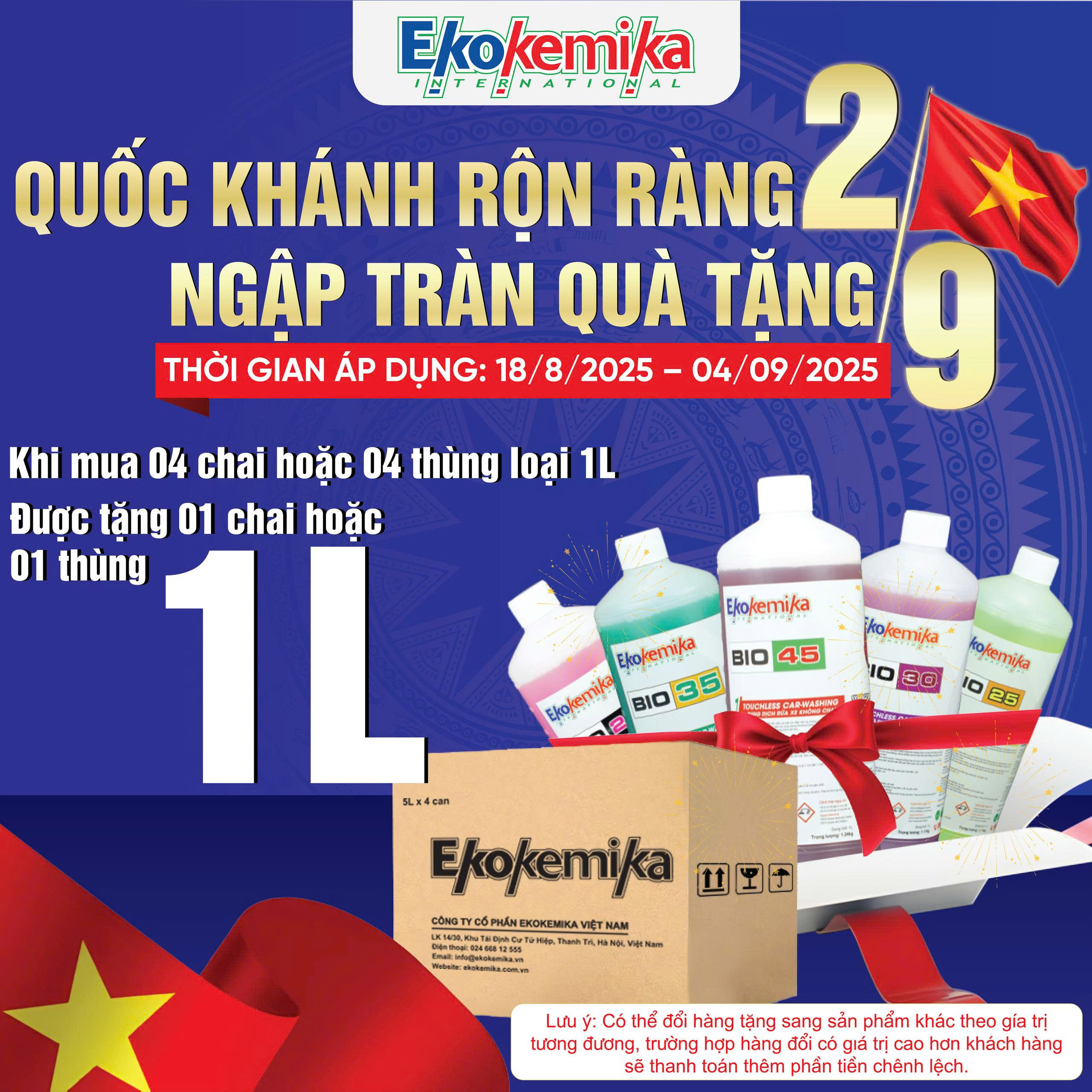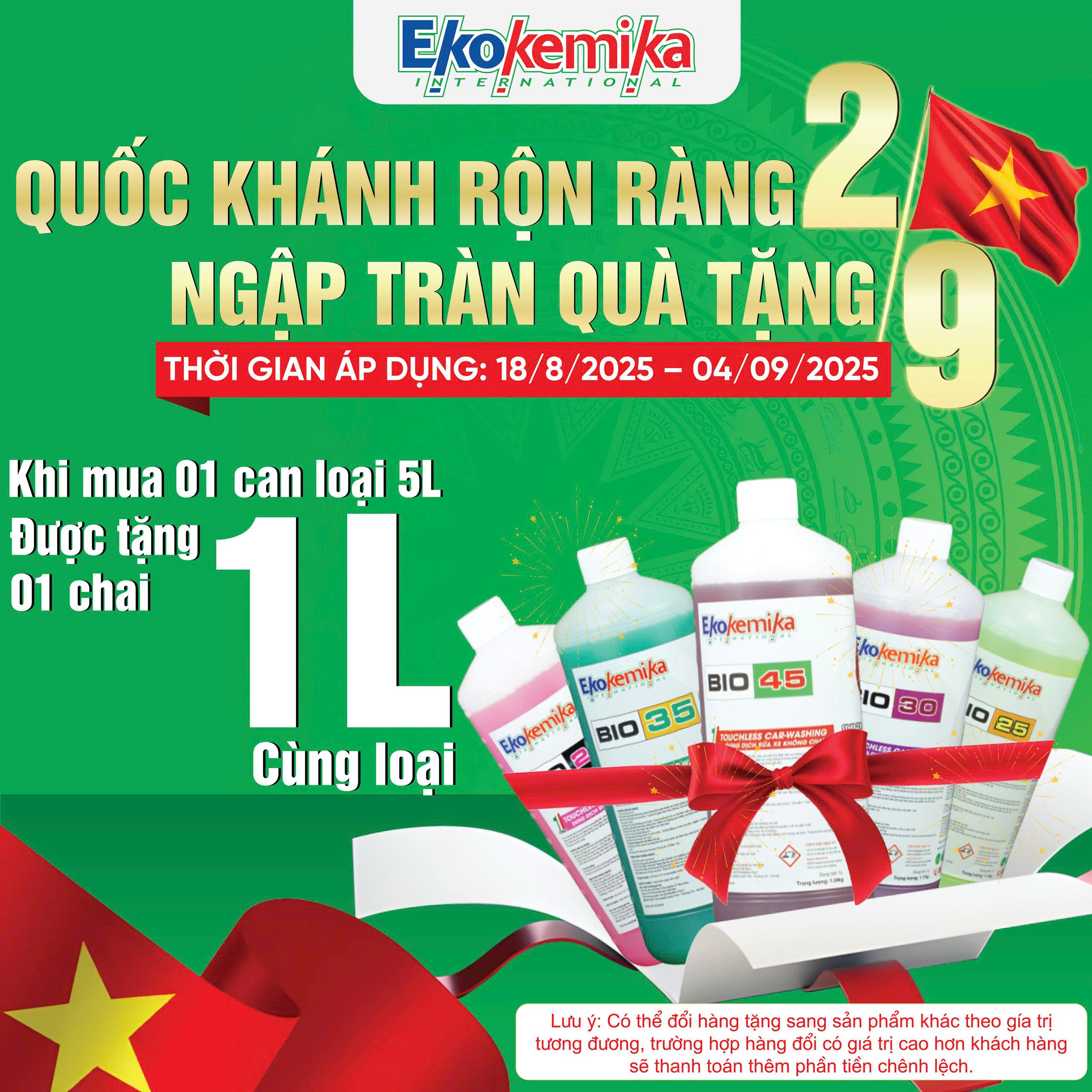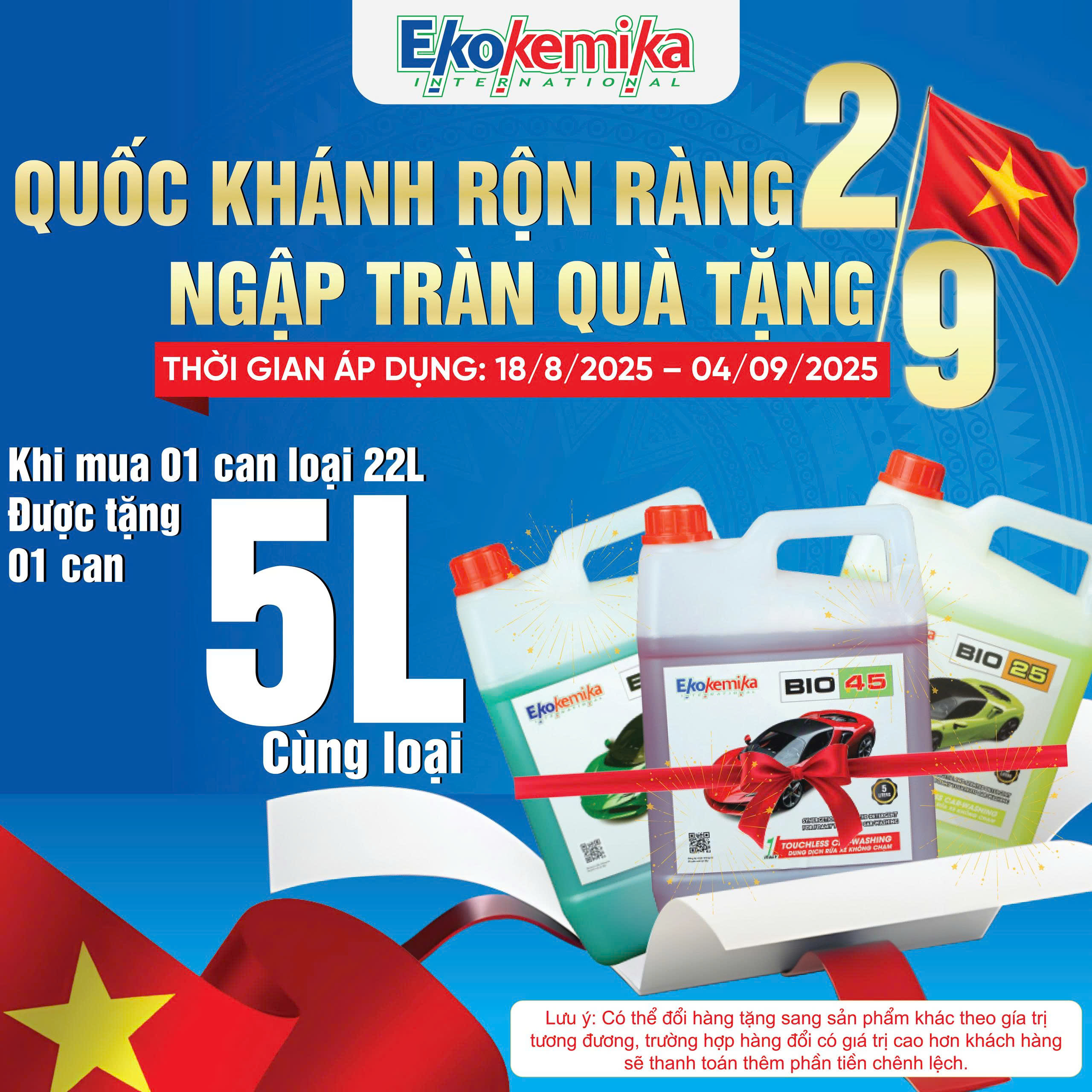 Chào mừng Quốc Khánh 2/9, Ekokemika Việt Nam mang đến chương trình khuyến mãi lớn nhất năm! Mua dung dịch rửa xe không chạm, chăm sóc xe, nhận ngay quà tặng cực hấp dẫn. Áp dụng từ 18/08 đến 04/09/2025.